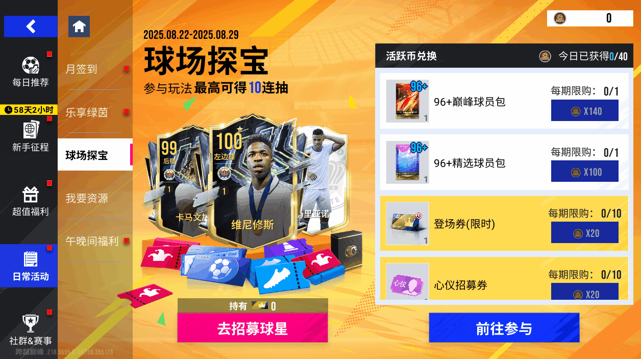 【球场探宝】每日获取代币上限提升,参与活跃活动获得代币,兑换 「登场券(限时)」、「96+巅峰球员包」等好礼!