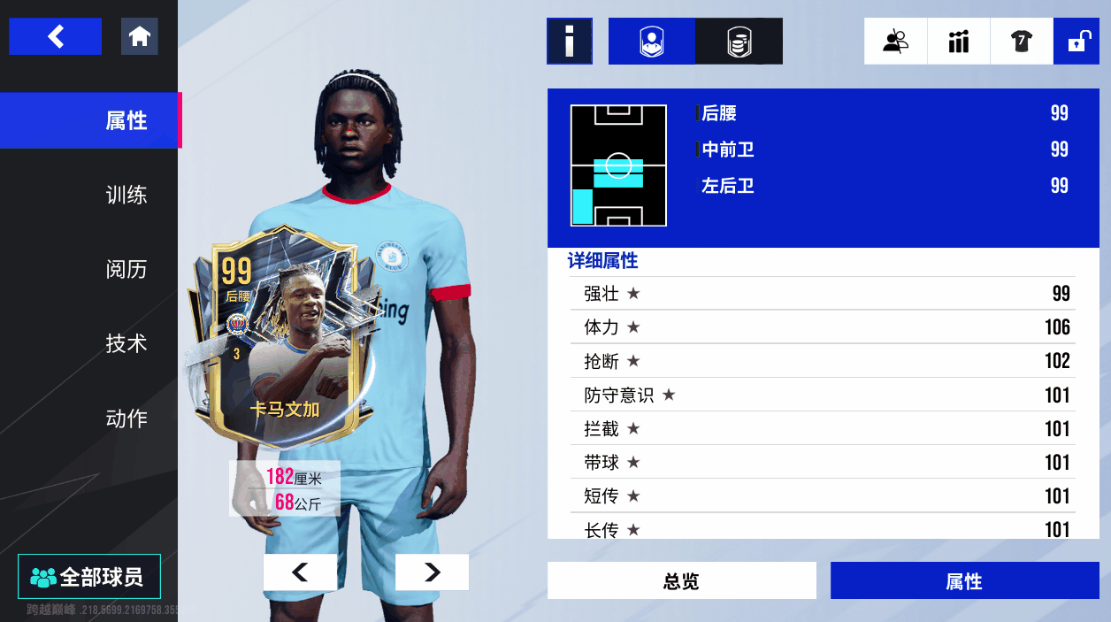 这张99潜力的巅峰闪回卡马文加所把守的中场,是许多进攻球员都难以逾越的天堑,防守数据全部破百的他,还拥有一众防守技术加持,金色的【跟防】【抢断】技术与【拦截】【封堵】【协防】【经验老道】技术融会贯通,让他成为一把铁锁,牢牢封死住对面的箭头人物,除了出色的防守功力,卡马文加的身体素质也极其出色,不仅凭借【强壮】【启动】技术的提升,拥有了出色的身体对抗和回追补防能力,【孜孜不倦】技术和106的体力更是让他化身“铁肺战神”,用永不停歇的跑动化为场上的燎原烈火,将对手统统吞没!