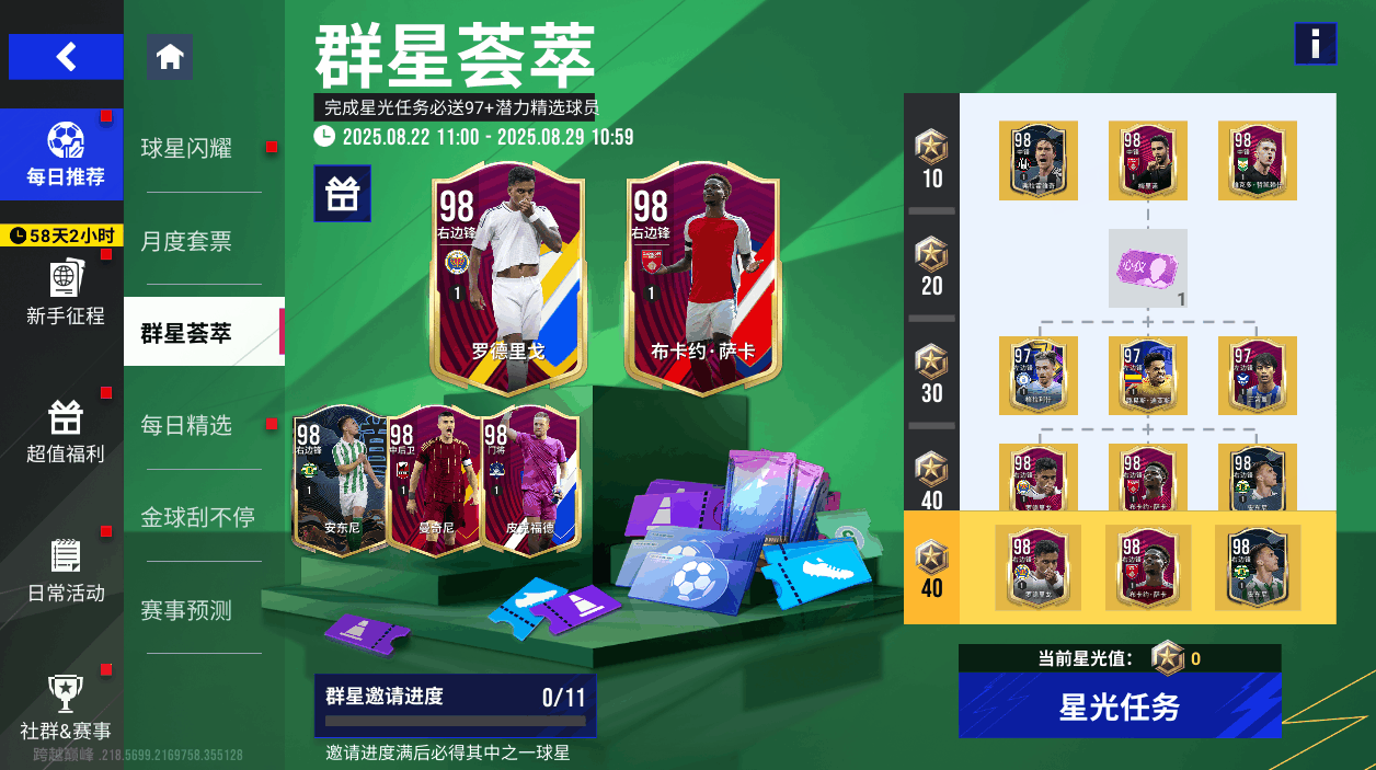 8月22日11时-8月29日11时期间,通过完成星光任务,选择自己的11人阵容,最终必得1名潜力97+强力精选!