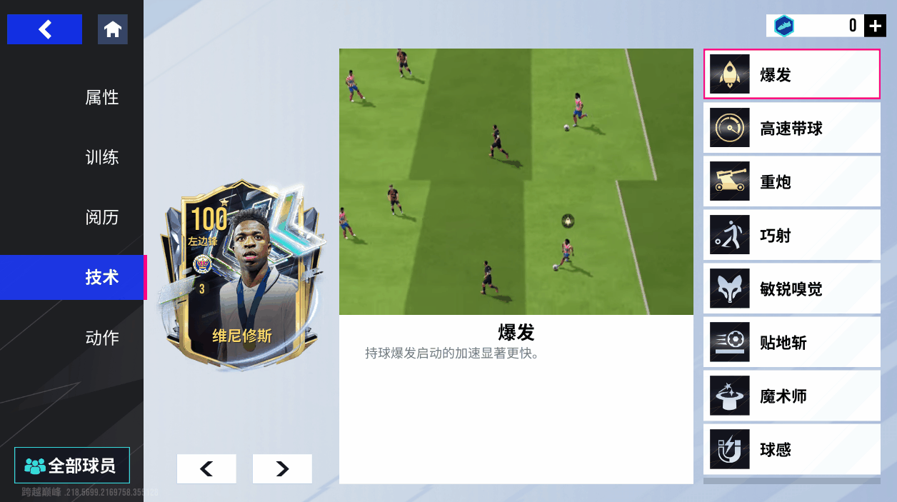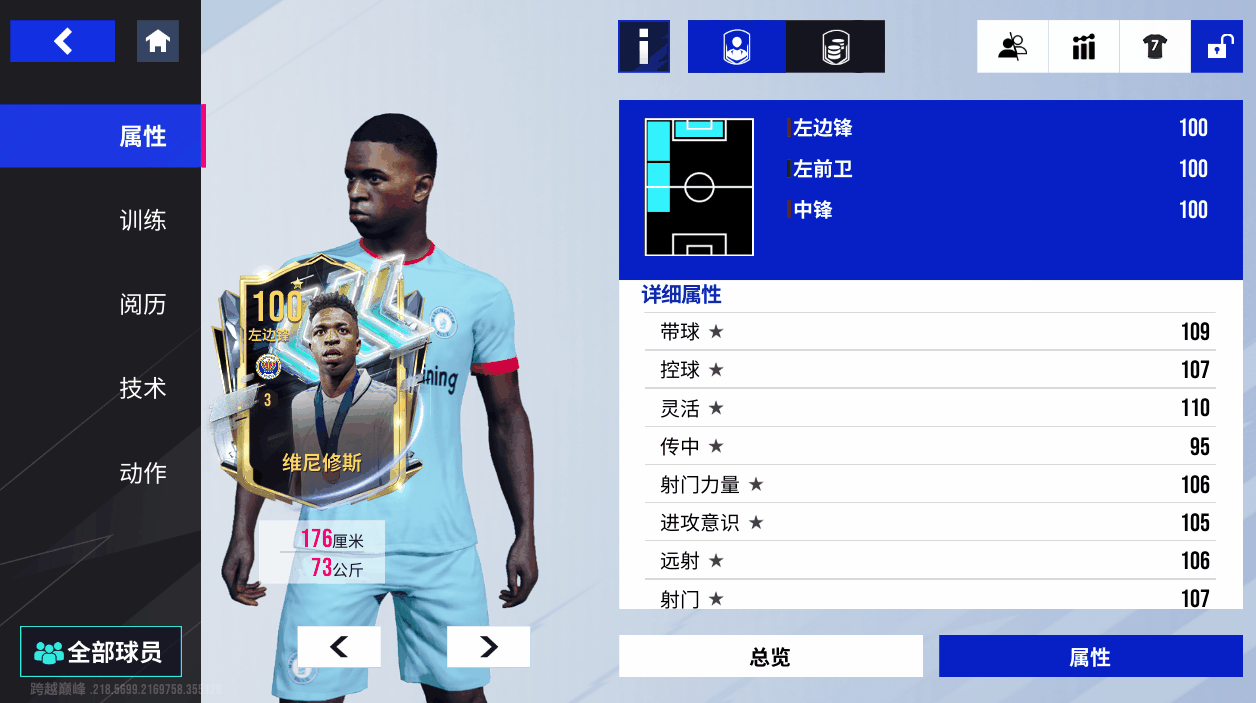 当球来到维尼修斯脚下时,对手的防线就会瞬间拉响警报,因为这道边路闪电会随时让球队的防守土崩瓦解!111的速度和109的加速让维尼修斯有着游戏内冠绝群雄的冲刺能力,搭配上109的带球、110的灵活能力,以及自带的金色【爆发】【高速带球】技术和【魔术师】【球感】技术,只要维尼修斯选择带球启动,就仿佛进入无法阻拦的异次元空间,用旋风般的速度与带球撕扯出巨大的空间!除了最赖以成名的边路纵深能力,维尼修斯的得分能力也是毋庸置疑,107的射门能力与106的远射和射门力量甚至超过了一众中锋,还有金色【重炮】技术和【巧射】【敏锐嗅觉】【贴地斩】技术的加持,无论是自己带球后的内切打门,还是无球跑动寻求空隙后的门前抢点,“小熊”都是球队最值得信任的终结点!