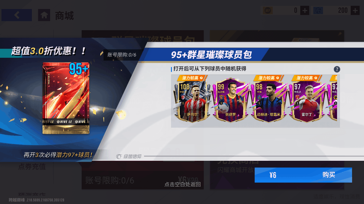 8月22日11时-8月29日11时期间,可在商场购买【95+群星璀璨球员包】,账号限购6次。打开后可获得95-100潜力球员,打开3次必出97+,更有机会获得【100巅峰萨乌尔】!