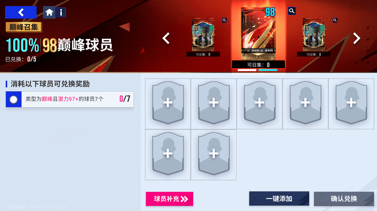 【98巅峰球员包】阵容召集挑战将于8月22日11时至8月29日11时开启,活动期间累计可进行5次召集挑战,按条件使用指定球员进行召集必得98巅峰球员。