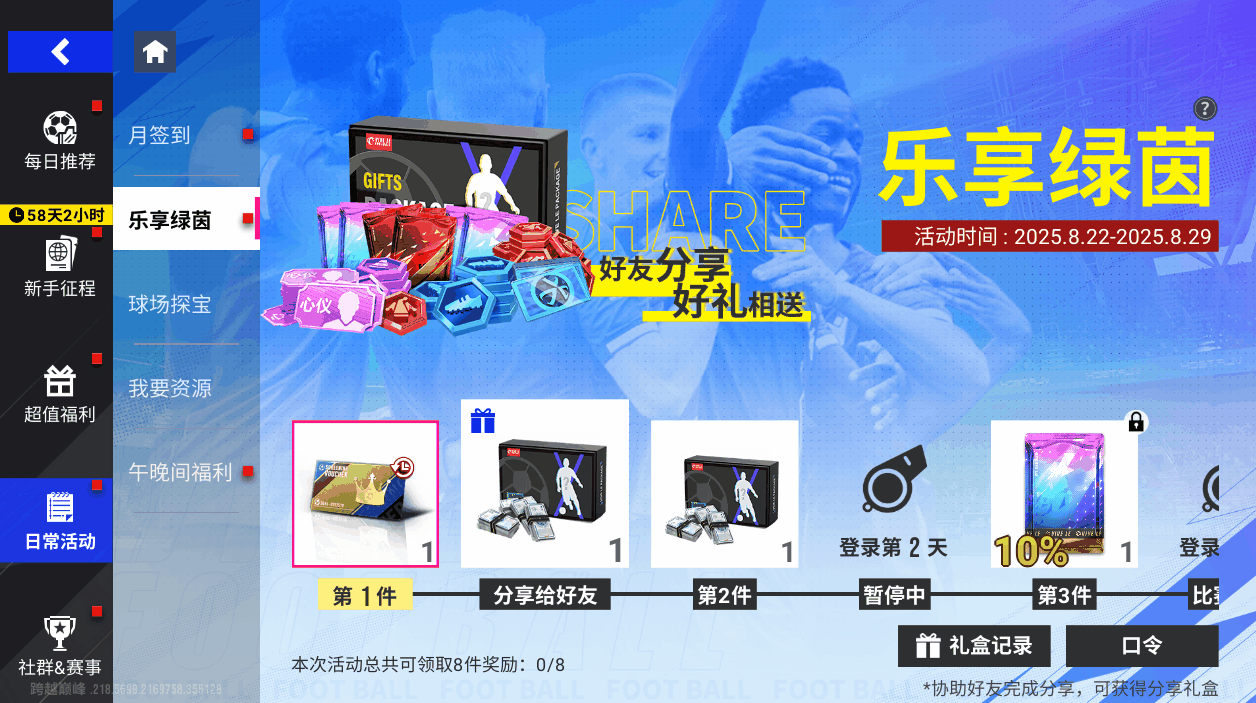 8月22日11时-8月29日11时期间,签到分享领好礼、分享也可获得「分享礼盒」奖励!