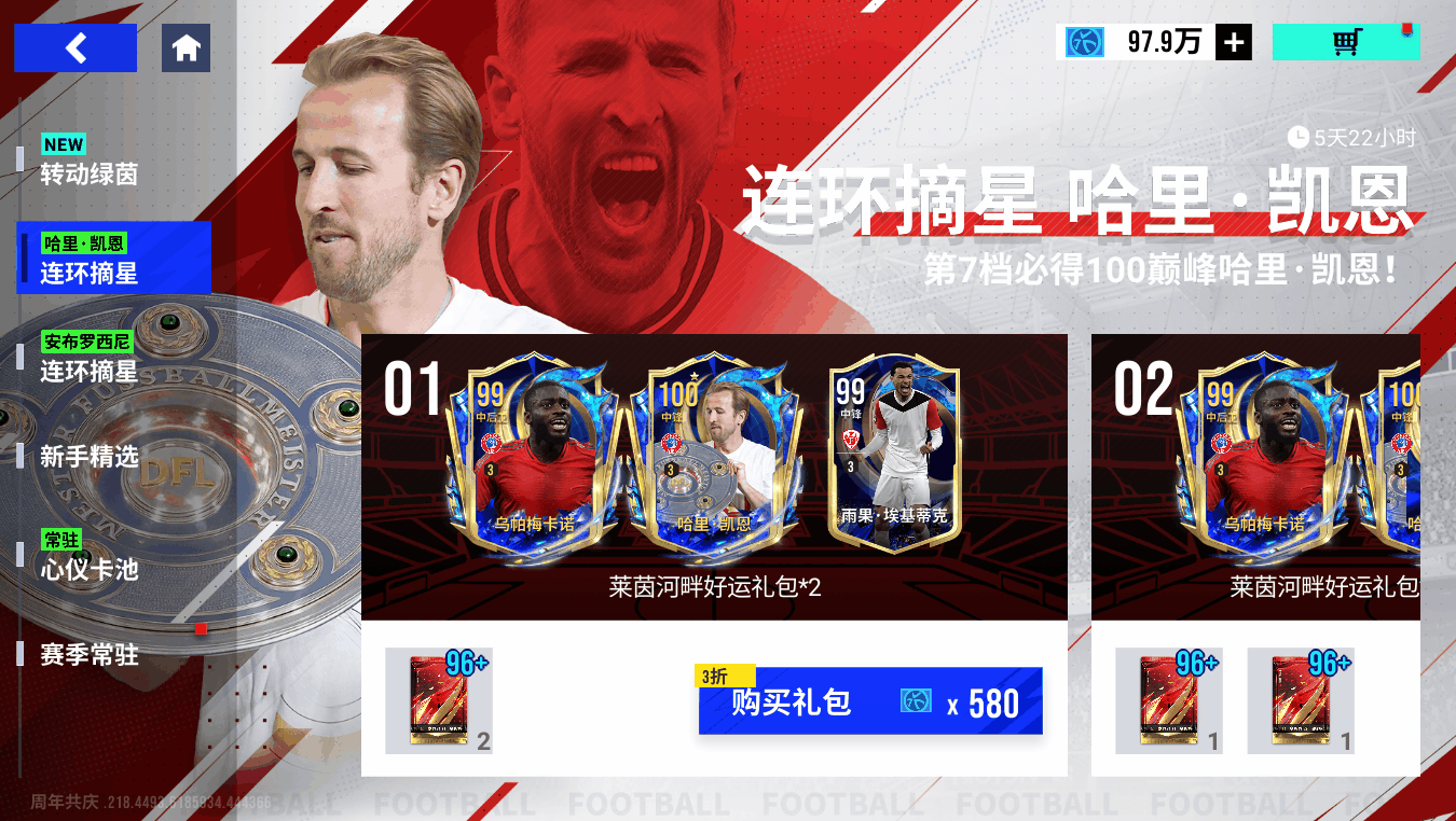 10月24日11时-10月31日11时期间,通过参与活动购买连锁礼包,有机会获取100潜力值巅峰哈里·凯恩 、99潜力巅峰乌帕梅卡诺!