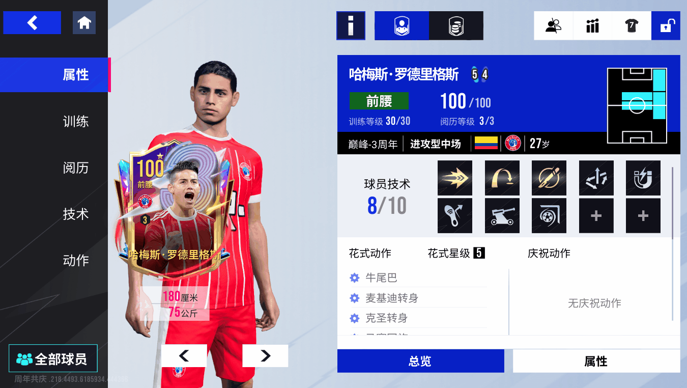 作为“前场进攻大师”,这这张 100 潜力值的哈梅斯・罗德里格斯在进攻端多个关键角色中都能绽放光芒。105带球、107控球搭配103灵活,让他在进攻端持球时“粘球感”拉满,花式动作下突破防线如闲庭信步;金色【直塞】技术加持,让他的穿透性传球精准度大幅提升,107短传的调度,小范围配合丝滑流畅,能瞬间梳理出致命进攻线路;109远射、101射门搭配107射门力量,再加上【重炮】技术,让他的远射如“炮弹”般极具威胁,禁区外重炮轰门是常规武器;108长传、105传中搭配金色【大力传球】【挑传】技术,远距离传球球速与精准度拉满,无论是45度起球还是挑传身后,都能精准找到锋线队友。100加速让他反击时启动如闪电,95体力支撑全场高效奔跑与组织。从灵动盘带到致命一传,从远射重炮到边路传中,J罗凭借全面的进攻属性与金色技术加持,堪称“前场进攻万花筒”,是令对手防线顾此失彼的“前场核心”!