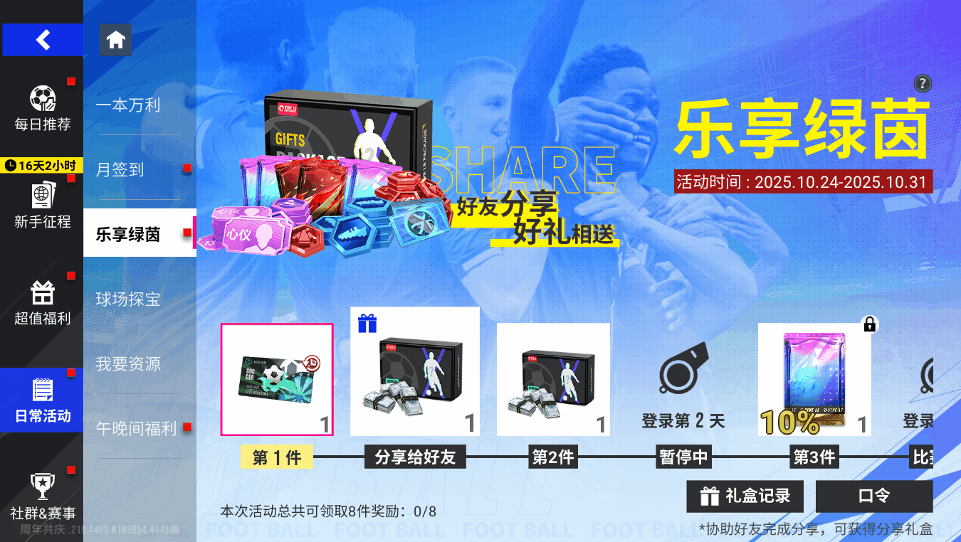 10月24日11时-10月31日11时期间,玩家签到分享领好礼、分享也可获得「分享礼盒」奖励!