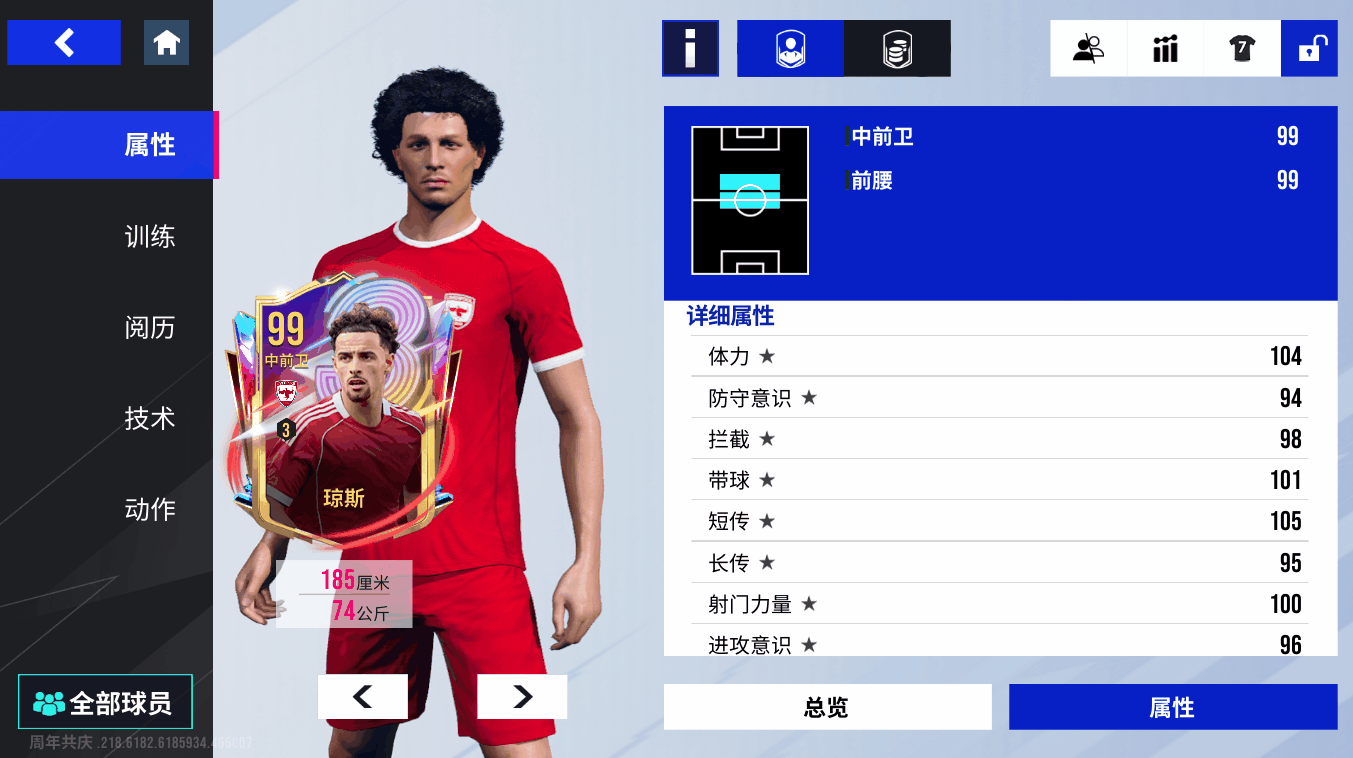 99潜力值的琼斯在中前卫、前腰位置将“传控艺术+全域覆盖”的特质拉满!金色【Tiki-Taka】技术让他短距离地面传球精准度显著提升,105短传、103控球的搭配使他在中场的传接如“精密仪器”般流畅;金色【长传】技术加持下,95长传、101传中让他的调度极具穿透力,既能送出长传策动进攻,又能在边路送出精准传中。102抢断让他在中场的拦截硬度拉满,100速度、98加速的机动性令他覆盖全场,104体力支撑高效奔跑。从细腻传控到攻防覆盖,他是球队中场的“节奏引擎”!