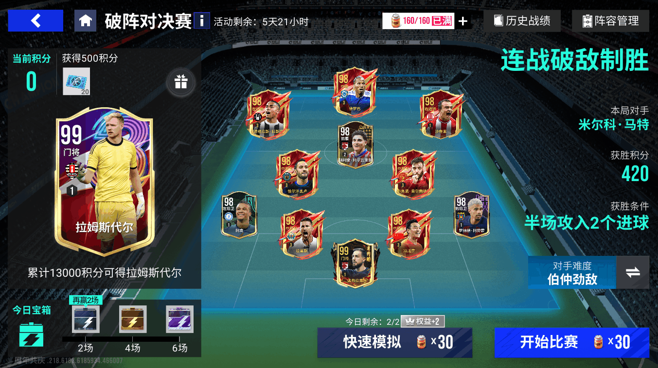 【破阵对决赛】11月7日11时至11月14日11时开启!玩家可以连续挑战随机对手,每次遭遇的对手阵容都是真实玩家的镜像阵容,获胜之后可以获取积分,累计积分必得99精选拉姆斯代尔!同时每日完成一定次数的挑战还能获得每日活跃宝箱。