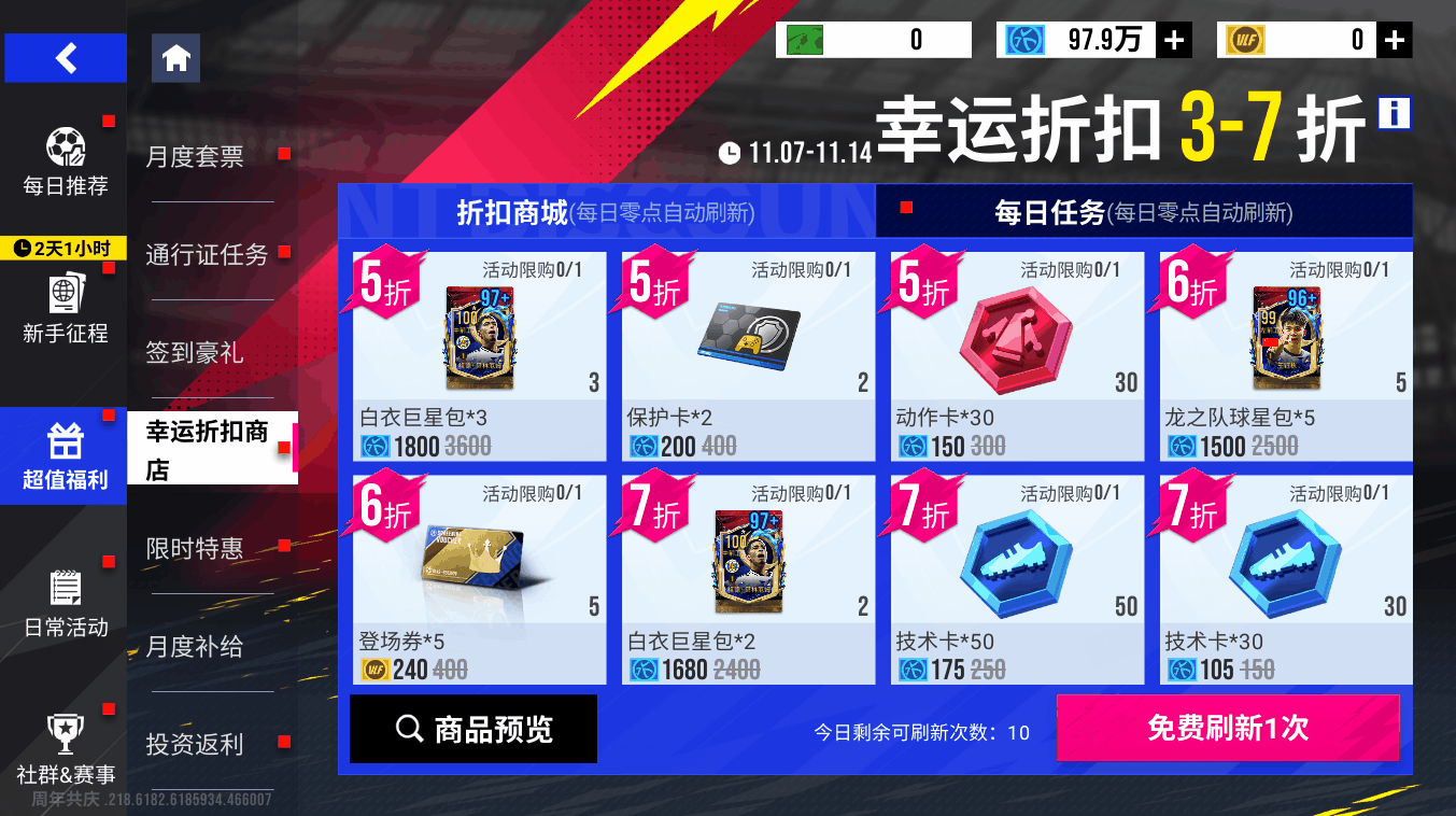 11月7日11时-11月14日11时期间,幸运折扣商店全新改版,刷新券可以同时刷新商品种类和折扣,最低可至3折,玩家可以通过完成任务获得刷新券,可购买【意大利巨星包】、【白衣巨星包】、【蓝月星耀包】、【利物浦红球星包】等奖励!