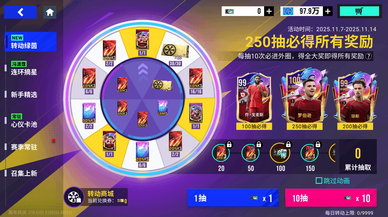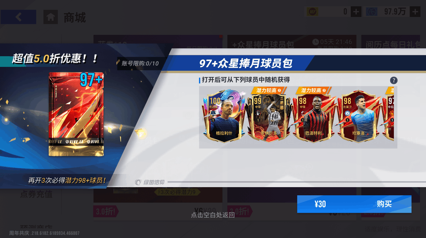 11月7日11时-11月14日11时期间,可在商场购买【97+众星捧月球员包】,打开后可获得97-100巅峰球员,账号限购10次,开启3次必出【98+巅峰】。