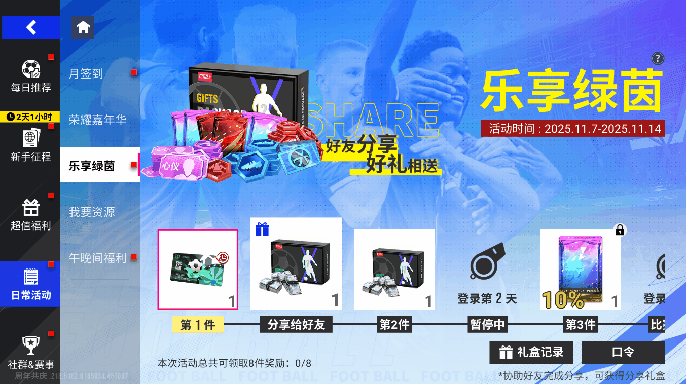 11月7日11时-11月14日11时期间,玩家签到分享领好礼、分享也可获得「分享礼盒」奖励!