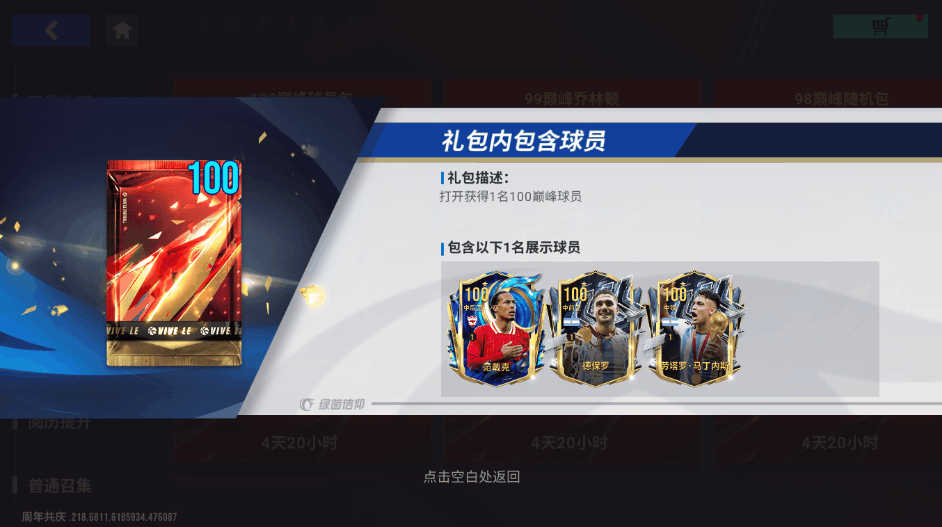 11月14日11时-11月21日11时期间,可在商场购买【97+众星捧月球员包】,打开后可获得97-100巅峰球员,账号限购10次,开启3次必出【98+巅峰】。