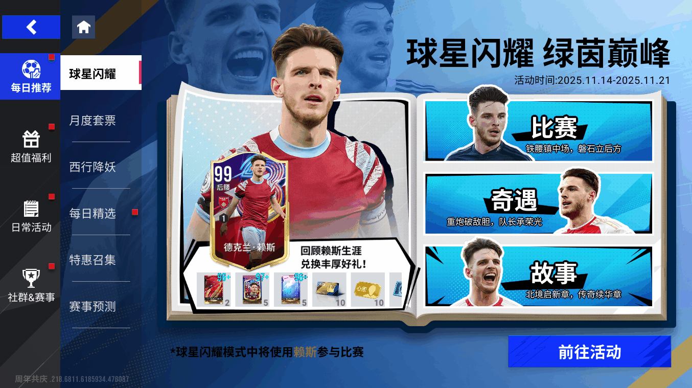 11月14日11时-11月21日11时期间,使用德克兰·赖斯,回顾英格兰铁腰的传奇生涯,兑换丰厚好礼!更有99精选赖斯等着您!完成任务获得星光币,可在闪耀商城兑换「96+巅峰球员包」「97+枪手球员包」「96+英格兰球员包」「登场券」「心愿招募券」!