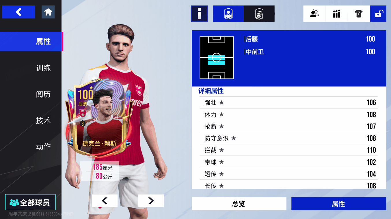 这张100潜力巅峰赖斯,堪称防守型中场的标杆,数据全面且防守属性拉满的他在中场统治力远超同级!调度端的他长传精准,108长传、104短传搭配【大力传球】【精密带球】【护球】技术,让他在由守转攻时宛如中场指挥官,总能用精准长传撕开防线,细腻控球护球摆脱压迫;在防守阵线时,自带金色【强壮】【拦截】【跟防】技术的他有着110拦截、107抢断,配合106强壮的身体对抗,中场拦截如铁壁般密不透风,化身对手进攻的 “拦路虎”,凭借大覆盖范围阻挠每一次推进;能在中场持续高强度防守与调度,更需充沛体能支撑,108体力加上【复苏之风】的加持,保障他全场不知疲倦奔跑,攻防两端无处不在。从铁血拦截到精准调度,他堪称筑牢球队中场的 “胜负屏障”!