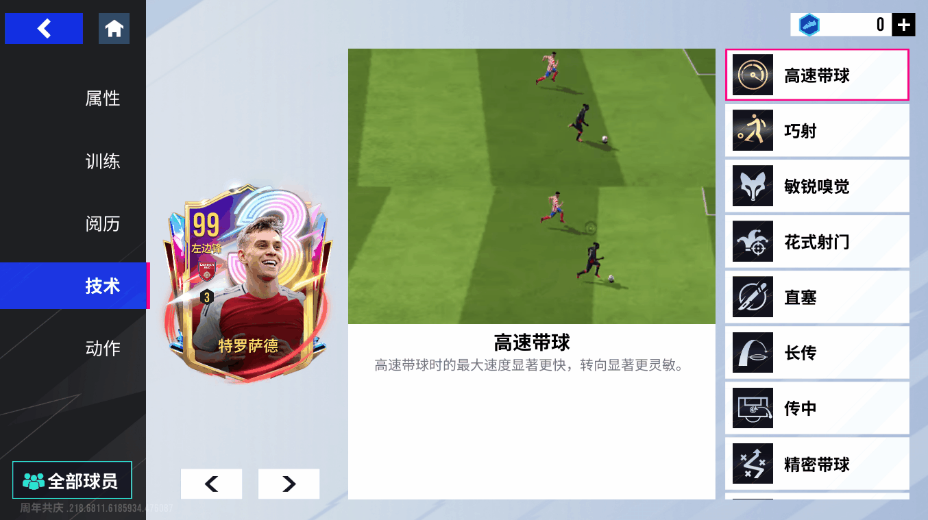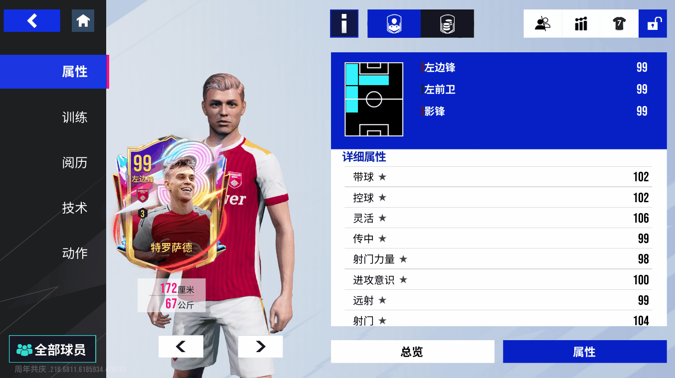 这张99巅峰特罗萨德是一张战力不俗的边路尖刀,他自带金色【高速带球】技术以及102 速度、105 加速 ,让他在带球奔袭的绝对速度更快,转向更加敏捷,可以凭借个人的突破能力为球队撕扯空间,打破僵局,而脚下技术全面的他在边路的威胁可不止于此,【直塞】【长传】【传中】技术赋予了他在下底后多样的传球分球能力,而内切打门更是他的拿手好戏,104的射门能力不用过多赘述,更何况还有金色【巧射】技术与98射门力量傍身,可谓是进攻手段极其丰富的“前场万花筒”。99传中的精准输送更是球队右路进攻的 “生命线”。从防守断球到边路奔袭射门, 这样一个传射突样样精通的边路快马,能为球队的进攻带来更多样的变化!