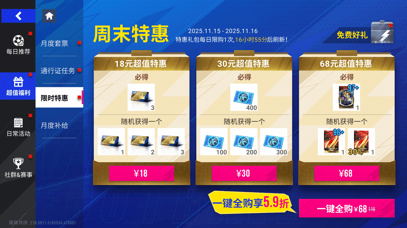 11月15日11时-11月16日期间,【周末特惠】惊喜上线!每日登录可以以优惠的价格购买「97+巅峰球员包」「登场券」等特惠商品,一次性打包购买更可享超值折扣!