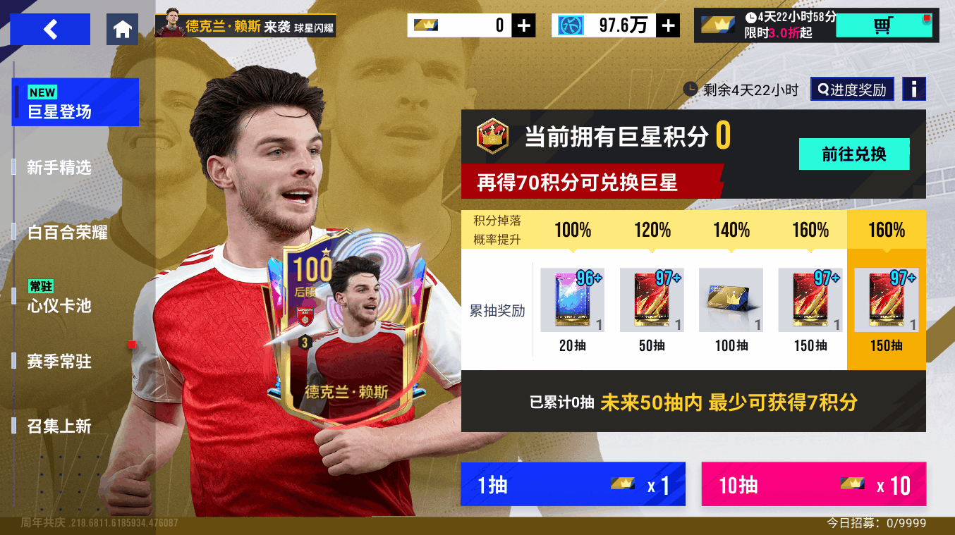 11月14日11时-11月21日11时期间,将开启巨星登场100巅峰-赖斯,每次开启都有概率获得巨星积分!可通过巨星积分兑换100潜力巅峰球员赖斯、99潜力巅峰特罗萨德、99潜力精选刘易斯-斯凯利,更可获得进度奖励「96+精选球员包」「97+枪手球星包」「98+枪手球星包」「30%保金精选包」等奖励!